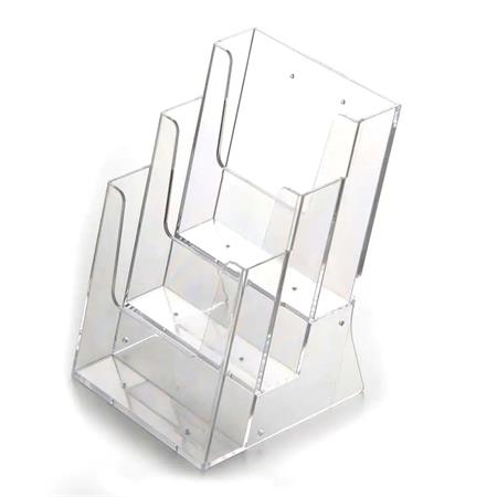 A 3 rekeszes asztali és fali szórólaptartó praktikus és sokoldalú megoldás többféle kiadvány egyidejű, rendezett megjelenítésére.